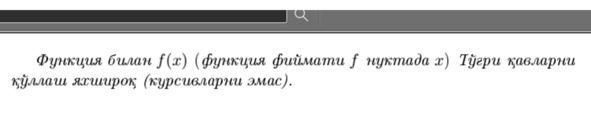 Agar simvolni kodini bilmasangiz uni o‘zini \symbol buyrug’i o‘rniga ‘\ simvol bilan simvolni o‘zini qo‘yish kerak.