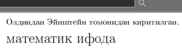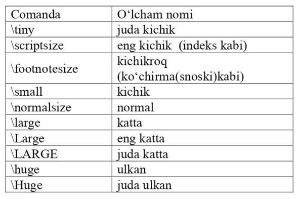 E’tibor qarating: \LARGE buyrug’i o‘zidan keyingi matnga ta’sir ko‘rsatadi. U shrift o‘lchamini karrali ortiradi.