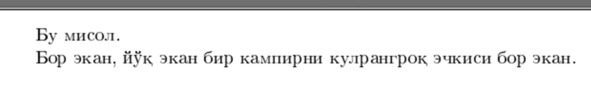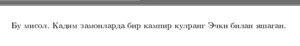 \documentclass {article} \usepackage [T2A] {fontenc} %% shrifni ko’chirissiz qo’shish\usepackage [russian] {babel} %% 3 Ingiliz matniga rus shriftini kiritish \begin {document} Комилжон ишга келиб 10—30 да чикиб кетди. Ivan come in hose/\end {document}