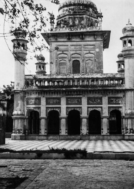 Колонны святилища-самадхи и расположенный рядом с ним Дарбар-холл. На обоих зданиях частично сохранилась искусная резьба и настенная живопись (1982)