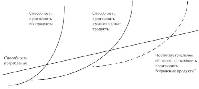 По мнению профессора И. В. Соколовой4, для характеристики постиндустриального общества важно использовать динамику соотношения производства и потребления в обществе, которая представлена на рис. 1.1.
