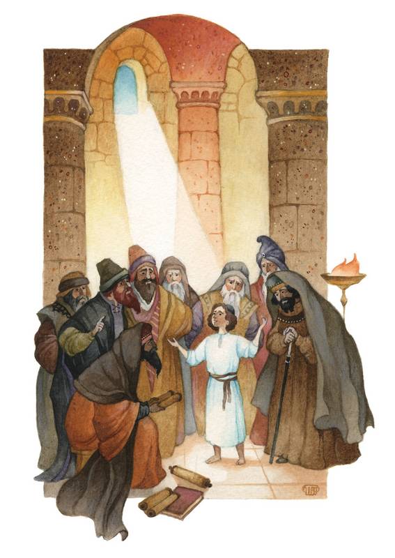 Три дня встревоженные родители разыскивали Сына, наконец в тяжком горе они вошли в Божий храм. Там они увидели священников, старейшин и книжников – знатоков иудейского закона. Посреди них сидел двенадцатилетний Иисус. Он задавал им вопросы и порой Сам по памяти отвечал, повторяя слова Священного Писания. Книжники и священники дивились речам Мальчика.