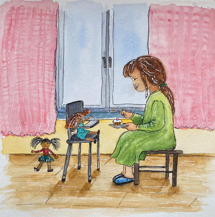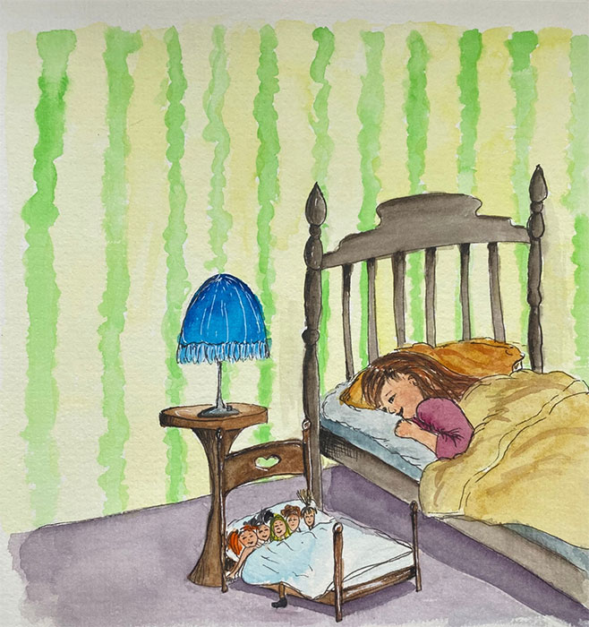 У меня пять кукол:Все доченьки мои.На ночь их баюкалаПеред сном своим.