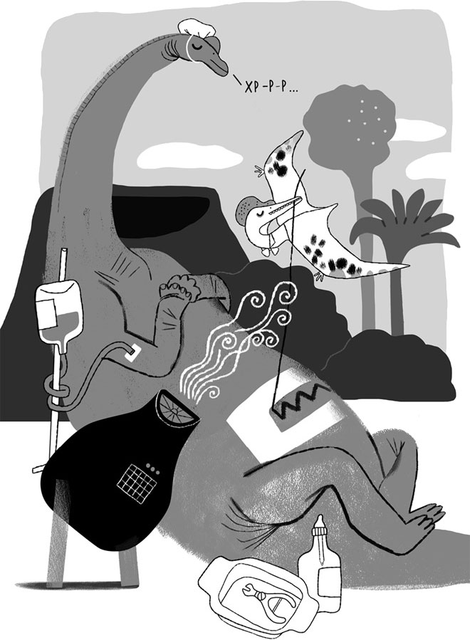 – Первый вызов в Доречье, квартал пятнадцать. Аламозавр Алик жалуется на головную боль. Сам прийти не может – болит нога.