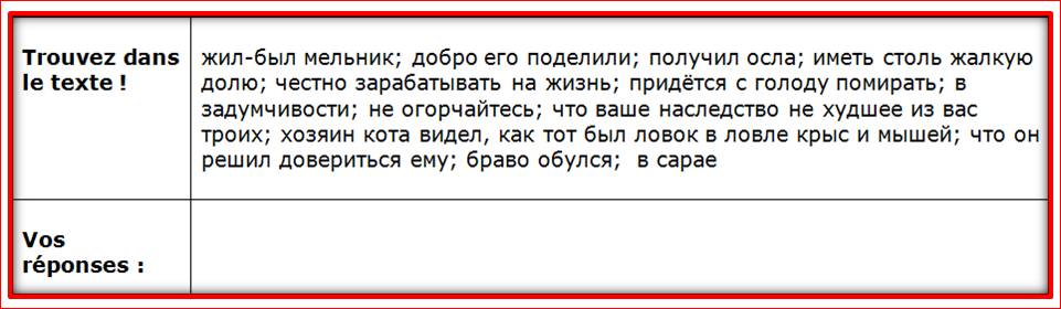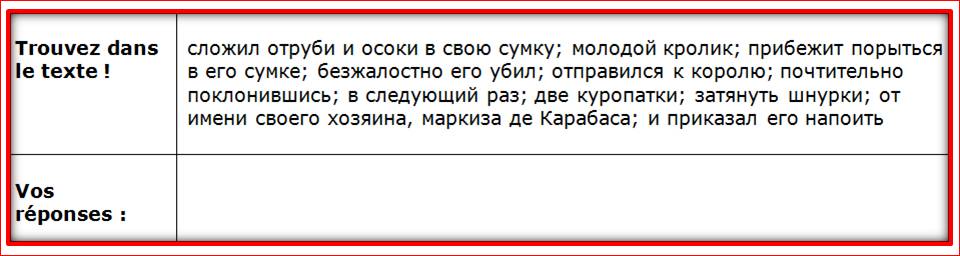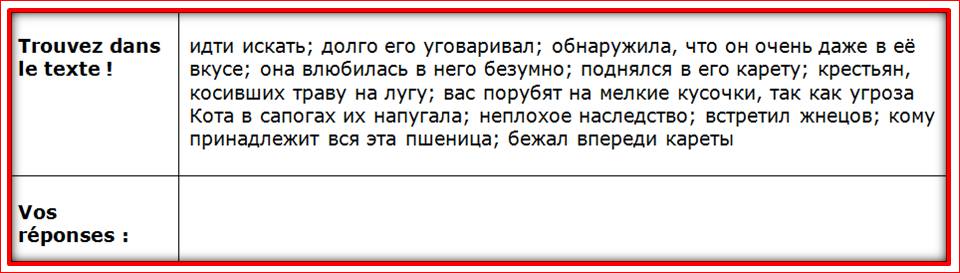 1. Le chat entend __ le discours de son maître. 2. Il dit de lui faire faire __ (заказать) une belle paire de bottes. 3. On le fait __ monter (проводить) à l’appartement de sa Majesté. 4. C’est le nom qu’il a décidé __ donner à son maître. 5. Le Chat botté commence __ porter du gibier au roi. 6. Le roi ordonne __ ses gardes __ aller vite au secours de M. Le marquis de Carabas. 7. Le chat voit __ les paysans qui fauchent le pré. 8. Le Chat botté s’approche __ château de l’ogre.