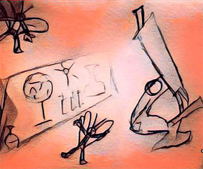 Жираф вошел в пещеру и не поверил глазам. В ней находилась научная лаборатория. Крохотные человечки с прозрачными крылышками перемещались в пространстве, выполняя кропотливую работу. Кто-то собирал, сваривал, соединял, и в этот момент произошло уникальное событие. Бил создал новейший аппарат, размером со спичечный коробок, который упал в его лапы.