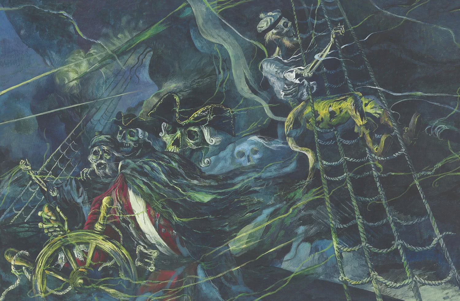 Он вернулся вместе с капитаном, но, едва поднявшись на палубу, оба офицера замерли в испуге. Прямо на барк, распустив паруса, двигалось необычное судно. Его мачты, канаты, идущие к мачтам, и паруса светились, словно натёртые фосфором. Зеленоватый свет излучали даже доски палубы и укреплённая на носу фигура полуженщины-полурыбы. Молча нёсся этот призрак навстречу барку.