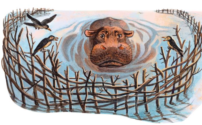 Неизвестно, когда он в неё попадётся, но говорят, что бегемоты обязательно попадаются в ловушку в один из первых пятидесяти дней после того, как её вырыли и закрыли сверху травой и ветками.