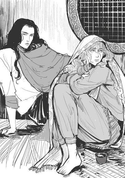 Сначала Нуска и Жамин молча выпивали из одной чаши, по очереди передавая её друг другу. Оанн же сидел тихо как мышка, ковыряя собственные пальцы.