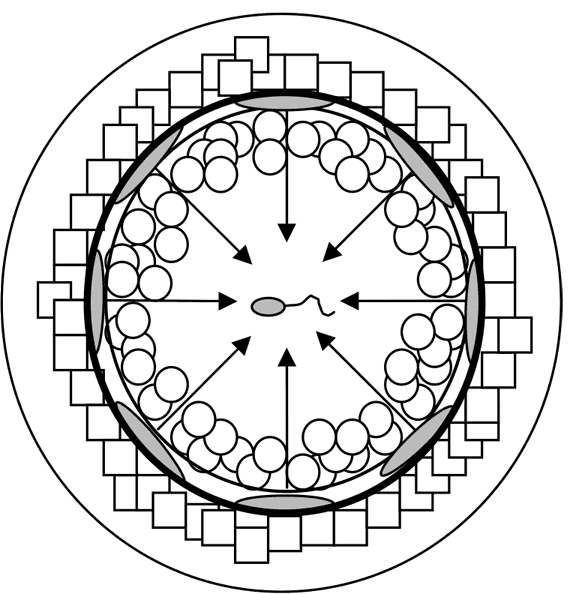 Таким образом, за счет состава и секреторной способности клеток образуются два из нескольких типов барьеров, о которых речь будет ниже: клеточного и гормонального. Благодаря этим барьерам рожденная вновь из базальной мембраны половая клетка надежно защищена от воздействия извне.