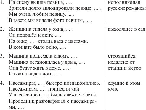 1. Помню их (отца и мать) спящими спина к спине. Помню их читающими там, разговаривающими, глотающими таблетки, борющимися по очереди с болезнями… <…>…я не увижу отворяющуюся дверь и её, вплывающую в комнату с обедом, ужином, чаем, десертом. 2. И вот уходящий президент и уходящая вместе с ним администрация заняты решением того, кто станет следующим президентом. 3. У общества нет контроля за происходящим. 4. Таким образом, культура – то, что с течением времени превратило говорящее млекопитающее в человека. 5. Они живут будущим и во имя будущего. 6. Около машины стоят рабочие, ремонтирующие дорогу.