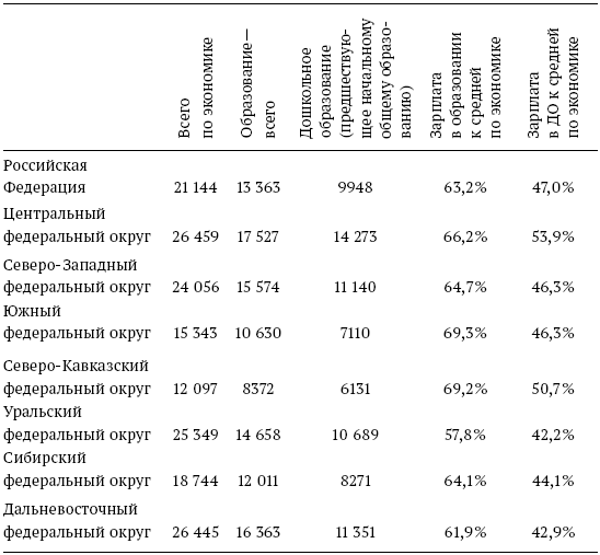 Доля бюджетных расходов на дошкольное образование в ВВП выросла за рассматриваемый период практически на треть. Правда, основной рост данного показателя приходится на 2009 г., когда ВВП России значительно снизился, но в 2010 и 2011 гг. бюджетные расходы на дошкольные образовательные учреждения продолжали расти, что позволило стабилизировать их долю в ВВП на уровне выше 0,7 %. При этом заработная плата работников ДОУ оставалась самой низкой в системе образования (табл. 3).