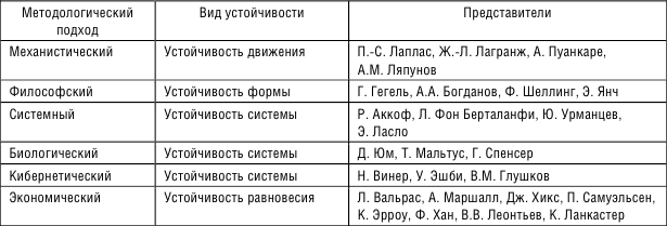 Заметим, что теория устойчивости имеет давнюю историю, она возникла как ветвь других отраслей знаний и научных дисциплин: математики, кибернетики, теории систем и др. Ее основы заложены философами, математиками, физиками, биологами. Ими обоснованы различные методологические подходы к понятию «устойчивость», характеристика которых приведена в таблице 1.1.