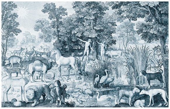 Адам и Ева в райском саду. Гравюра Николаеса де Брюна, 1600 г.