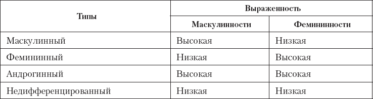Тест С. Бем (Bem S. L., 1979) и «Вопросник личностных свойств» Дж. Спенс и Р. Хельмрайха (Spence J. T., Helmreich R. L., 1979) рассматривают М и Ф уже не как альтернативы, полюсы одного и того же континуума, а как независимые измерения. Тест С. Бем разделял мужчин и женщин на четыре группы так, как показано в следующей таблице.