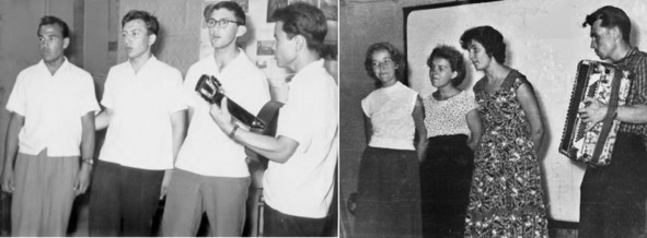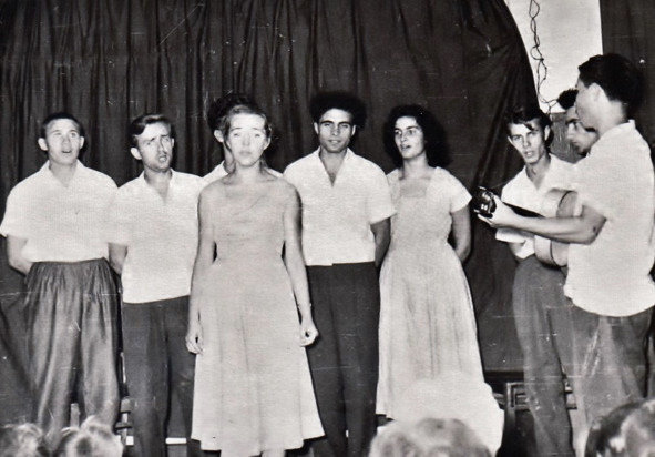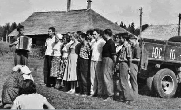 1959.07. Подмосковье. Концерт начинается выступлением хора: Александр Кузнецов (баян), Рустэм Любовский, Наталия Козлова, Галина Волошина, Светлана Солодченкова, Валерий Цой, Анатолий Фельдман, Лев Хямяляйнен, Михаил Балашов, Тамара Константинова, Андрей Фрейдин, Михаил Размахнин