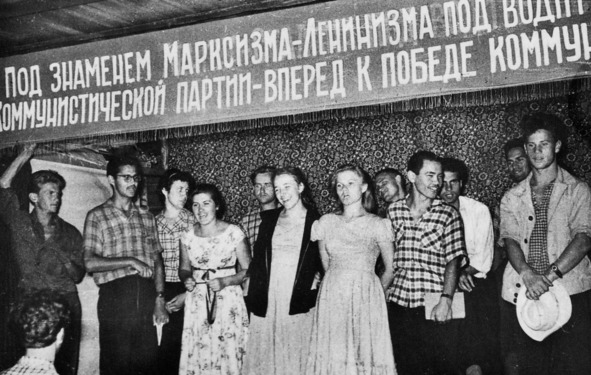 1960.07. Леонид Лазутин – начальник агитпохода. В строю: Владимир Петинов, Сергей Илларионов, Тамара Константинова, Светлана Солодченкова, Нинель Фастовец, Алла Павлова, Геннадий Новиков, Георгий Иванов, Геннадий Яковенко, Рустэм Любовский