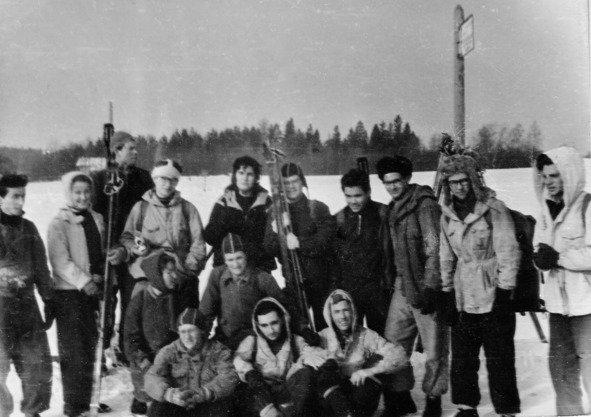 1960.02. Подмосковье. Виктор Дубнер, Светлана Солодченкова, Михаил Балашов, Леонид Вильнер, Тамара Константинова, Олег Андреев, Валерий Цой, Рустэм Любовский, Юрий Тратас, Сергей Кузьминых, Анна Трушицина, Михаил Размахнин. Три китайца: Александр Зацеляпин, Андрей Фрейдин, Леонид Лазутин