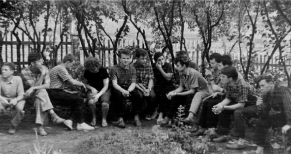 1961.07. На лавочке: Лев Перецман, Рустэм Любовский, Александр Кочкин, Неля Фастовец, Эдуард Копылов, Юрий Курочкин, Алла Павлова, Вячеслав Смирнов, Роберт Касимов, Валерий Ириков, Владимир Дубинин, Геннадий Яковенко