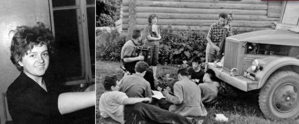 1962.02. «…Такая корова нужна самому»: Эмма Скляренко, Александр Филиппенко, Владимир Любченко. Справа – после обеда: Саша Филиппенко