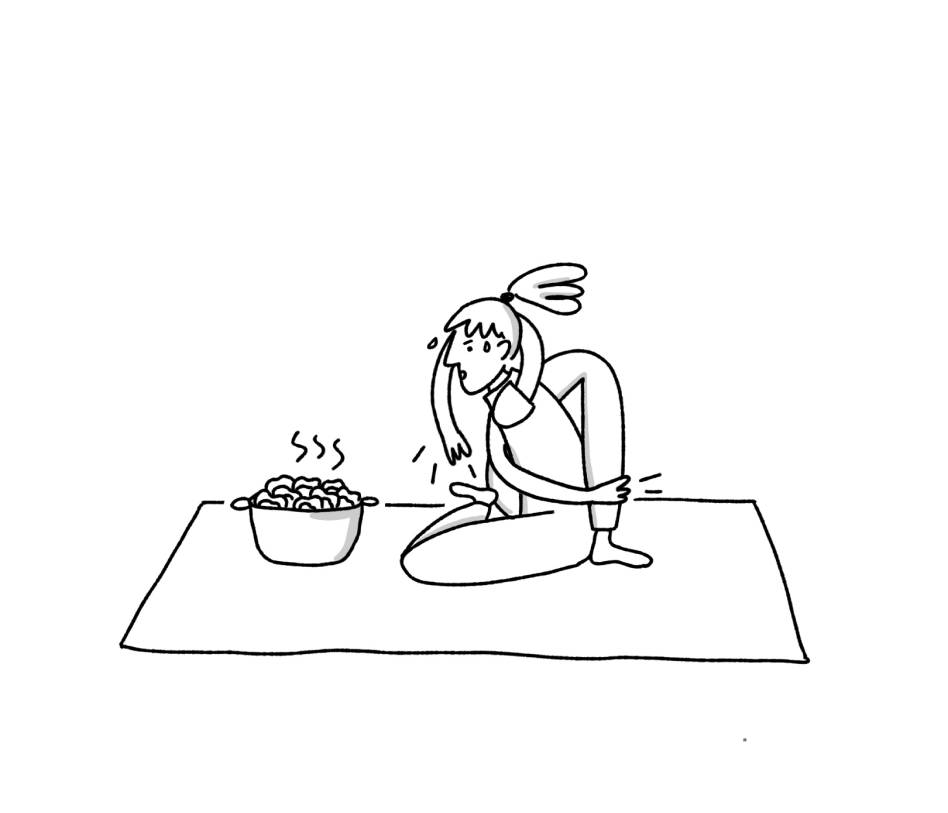 Дальше всё шло гладко: потянулись вверх, наклонились к коленям, ушли в собаку мордой вниз, отжались, потом мордой вверх, потом снова морду вниз. И тут снова дышать! Как в начале, только без ноздрей. У меня сразу поползли вверх плечи и стали разъезжаться ноги. Я выразила протест ─ села ждать следующую асану.