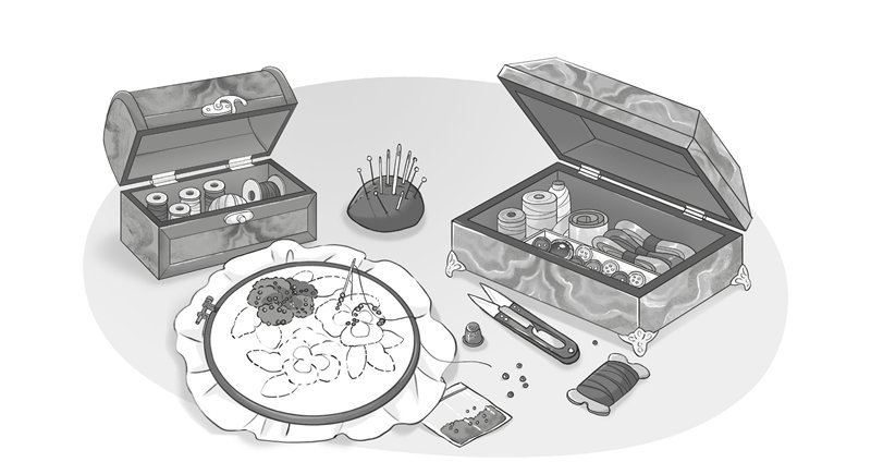 На столе стояли малахитовые шкатулки, наполненные материалами для рукоделия. Бабушка шутливо называла их дарами Хозяйки Медной горы. Отдельно лежала красная бархатная игольница, походившая на ёжика.