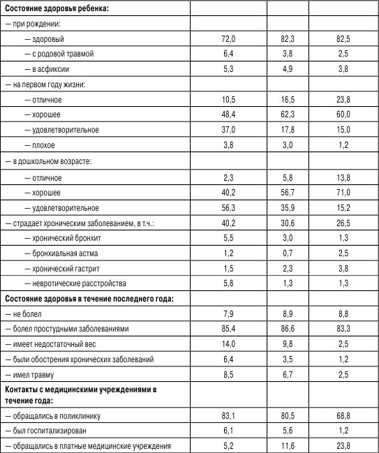 Особенности формирования здоровья в группах детей, происходящих из семей с разным социальным статусом, были изучены на детях г. Москвы, посещающих детские дошкольные учреждения, путем анкетирования родителей (опрошены родители 1100 детей 4–6 лет, родившихся после 1994 г.). Распределение семей по уровню материального благосостояния (бедные и малообеспеченные семьи – 31,8 %, семьи среднего достатка – 60,8 %, обеспеченные и богатые семьи – 7,4 % к общему составу опрошенных) основано на самооценке.