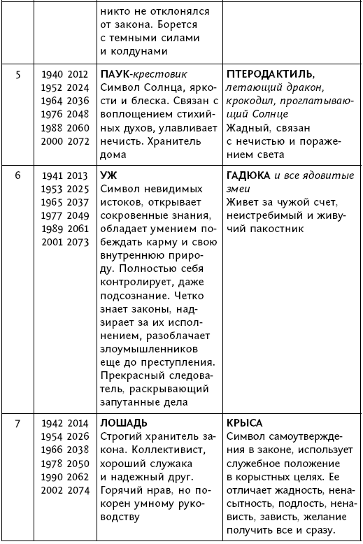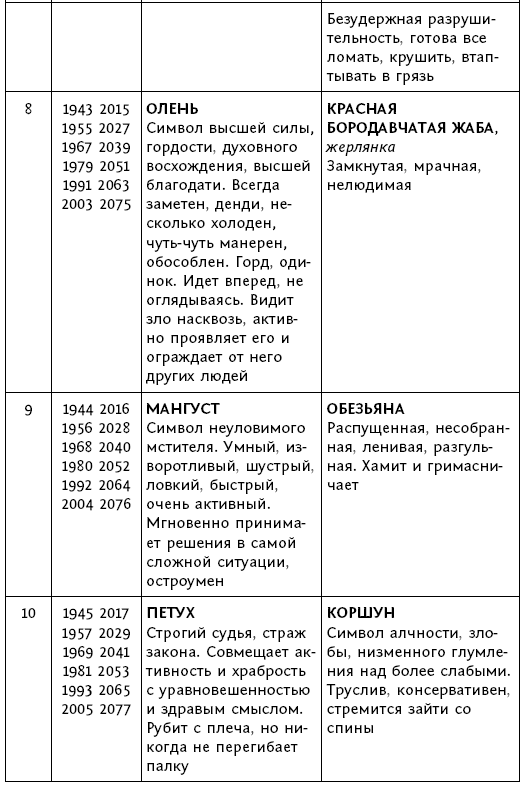 В восточном лунном календаре каждый год связан с каким-то животным (мышь, бык, тигр, кот, дракон, змея, лошадь, коза, обезьяна, петух, собака, кабан). Характеристика людей, рожденных в год того или иного календарного животного, определяется нахождением в этот год Юпитера в одном из знаков зодиакального круга (cм. таблицу 2). Проявление действия Юпитера в этом знаке с точки зрения астрологии зависит от планет в обители и в экзальтации в этом знаке и определяет психологические особенности людей, рожденных в это время, а также развитие событий социальной жизни в этом году.