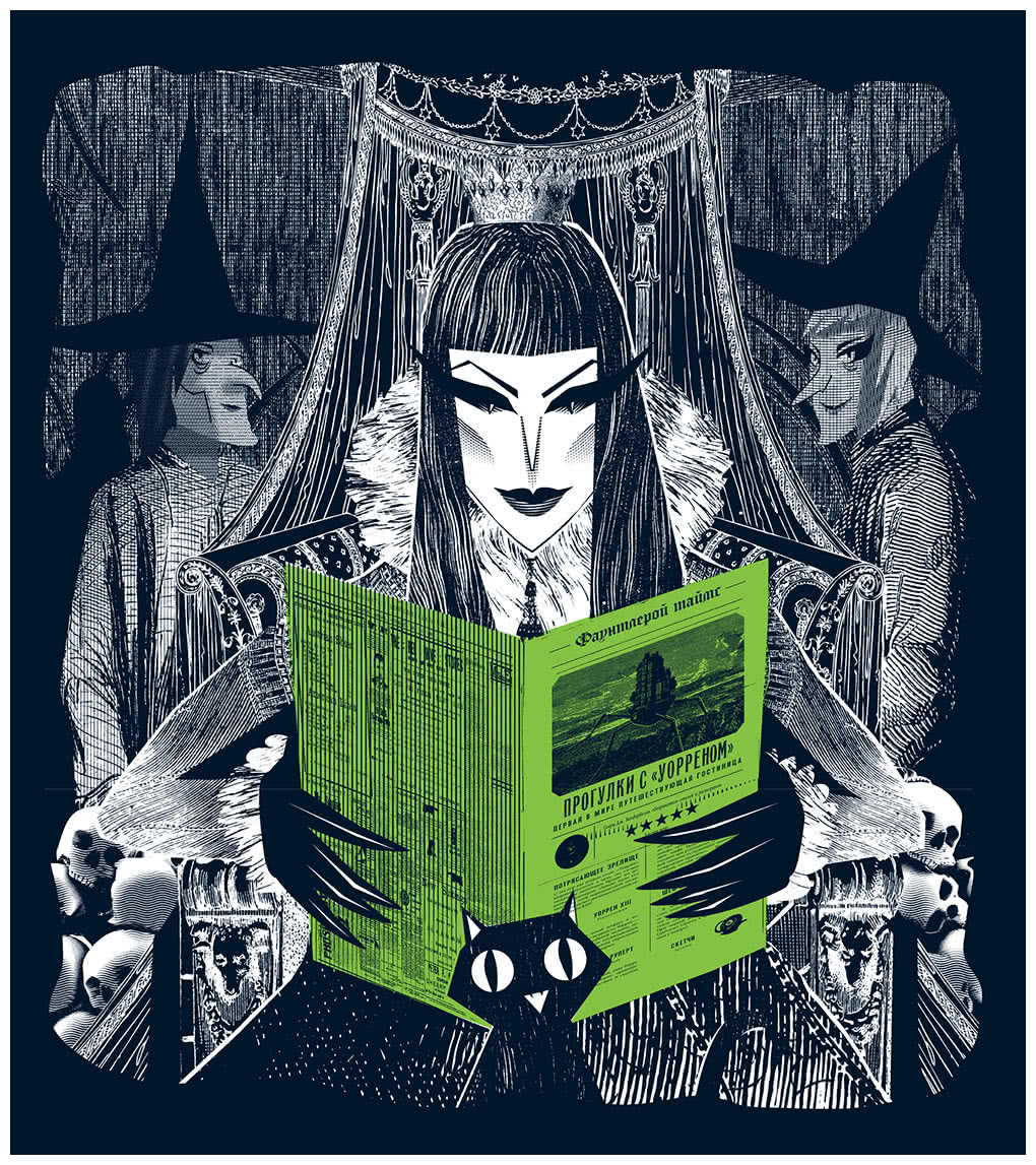 Вокруг нее сидели пять ведьм из королевской свиты. Четыре усердно изучали книги заклятий и варили зелья, пятая вязала чулки. Рядом стояли двое слуг-смоловиков. Эти заросшие волосами чудища жалобно смотрели на ведьм, и слышно было, как урчат их желудки. Досыта смоловики не ели вот уже много месяцев.