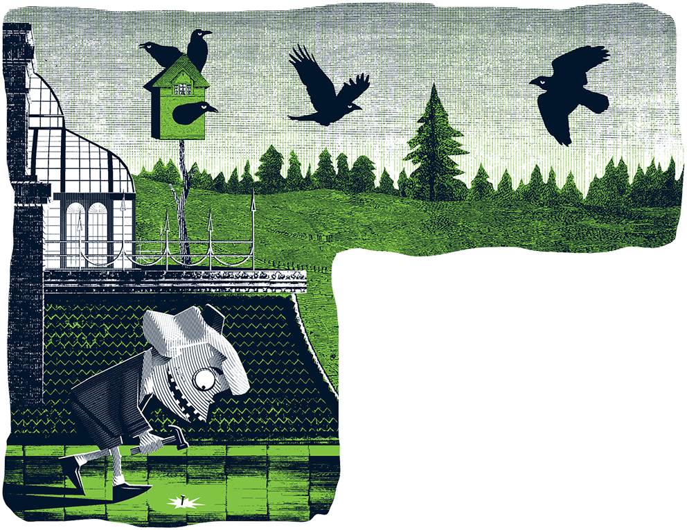 Он стоял на коленях на крыше, прибивая на место отвалившуюся черепицу. Шесть воронов, живших в гнезде наверху, высунули головы и закаркали: дай поесть! Уоррен отложил молоток и достал блокнот: между страницами блокнота всегда хранились пластинки сыра. Он кинул угощение птицам, и те заспорили, кому какой кусок.