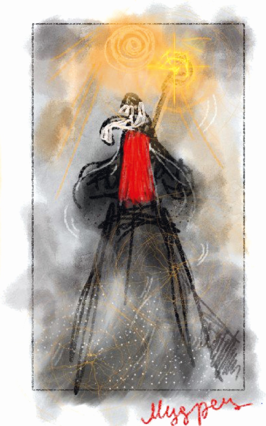 Теперь фигура странника видна на острой вершине выступа над обрывом, ветер разметает его седые волосы и бороду, рвет длинный черный плащ; внизу под смельчаком бушует кипящее сердитой серой пеной море. В его вытянутой руке взмахивающий древний посох превращается в волшебный жезл; кажется, это не сизые тучи стелятся над склонами гор, а он управляет стихиями, устремляет их в нужном направлении. В неистовых порывах воздушных масс звучат горячие струны, вихревыми потоками несущие к небу морские брызги, и небесные трубы, сопровождаемые громом и стрелами молний, раздаются из быстрых туч, а снизу, от земли несется бой вечных барабанов от неистовых накатов волн, бьющихся о скалы. Кажется, и сам человек звучит среди вселенского оркестра, и на несколько мгновений ему дана великая власть – вмешиваться в ход событий на земле.