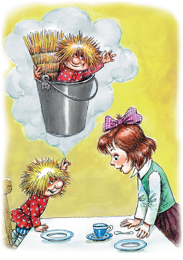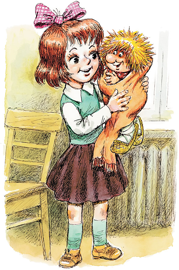 Девочка взяла веник, да так и села на пол, до того испугалась. Под веником кто-то был! Небольшой, лохматый, в красной рубахе, блестит глазами и молчит. Девочка тоже молчит и думает: «Может, это ёжик? А почему он одет и обут, как мальчик? Может, ёжик игрушечный? Завели его ключом и ушли. Но ведь заводные игрушки не умеют кашлять и так громко чихать».