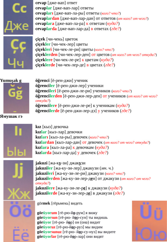 oturmak – сидетьkalkmak – вставатьasmak – вешатьkapatmak – закрыватьokumak – читатьyazmak – писатьsusmak – молчатьalmak – получатьgitmek – идтиvermek – даватьМножественное число существительных