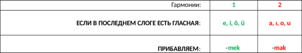 Если в последнем слоге основы глагола стоит одна из мягких гласных е, ü, ö или i (е или одна из 3-х гласных с точками / точкой наверху) прибавляется -mek, например: