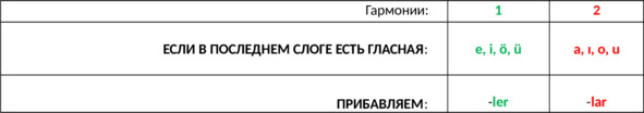 Для образования множественного числа существительных к ним прибавляются аффиксы (окончания) -ler /-lar по закону гармонии гласных на 2.