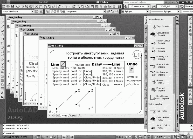 Tool Palettes Window (Ctrl+3) – инструментальные палитры в виде отдельных вкладок специального окна, которые служат эффективным средством хранения/вставки блоков и штриховки. Палитры могут содержать инструменты, предоставленные сторонними разработчиками;