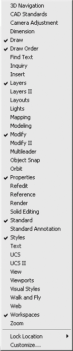 • Tools – управление рабочими пространствами; палитрами; установка порядка прорисовки объектов и получение сведений о них; работа с блоками и их атрибутами; работа с языком AutoLISP; работа с пользовательской системой координат; настройка стандартов оформления; управление Мастерами (публикации в Интернете, установки плоттеров, создания таблиц стилей печати, цветозависимых стилей печати, компоновки листа, создания подшивки, импорта параметров печати); установка параметров черчения и привязок с помощью диалоговых окон и пр.;