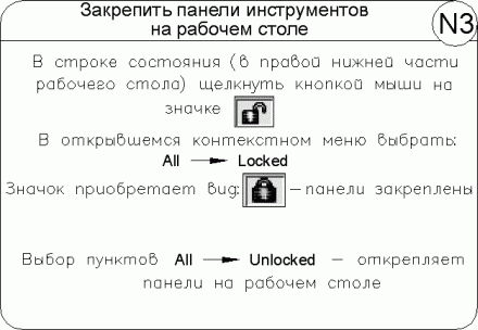 Если набор необходимых панелей и окон упорядочен на рабочем столе, во избежание их случайного перемещения или удаления пользователь может зафиксировать их положение. Для этого следует вызвать контекстное меню щелчком правой кнопки мыши на инструменте, изображающем замочек, в правом углу строки состояния и зафиксировать положение панелей: