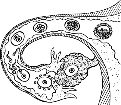 В момент овуляции яйцеклетка, выйдя из яичника и попав в маточные (фаллопиевые) трубы, совершает по ним путешествие благодаря течению жидкости, ритмичным сокращениям и движениям маленьких выростов в трубах (рис. 4). Туда же, в маточные трубы, после полового акта попадают сперматозоиды, где и происходит слияние яйцеклетки с самым сильным и энергичным сперматозоидом. А пока сперматозоиды хаотично двигаются во всех направлениях, большинство из них, подвергаясь воздействию кислой среды вагинальных секретов, погибают в течение нескольких часов, не достигая канала шейки матки. Очень небольшой процент от общего числа сперматозоидов в действительности добирается до полости матки и предпринимает путешествие вверх.