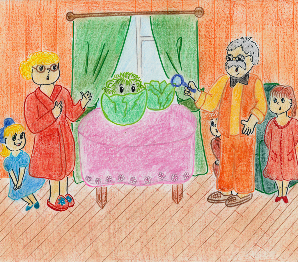 Вдруг кто-то позвонил в дверь, и бабушка пошла посмотреть, что это за поздний гость. Через некоторое время удивленная бабушка вернулась в комнату, в руках она держала большое- пребольшое яйцо. Да-да, самое, казалось бы, обыкновенное яйцо. Но в том-то и дело, что это было совсем не обыкновенное, а очень странное яйцо. Оно было большое, как подушка, и ярко-зелёного цвета. Маша и все, кто находились в комнате, сильно удивились, а дедушка взял свою большую лупу и стал рассматривать яйцо на свет.