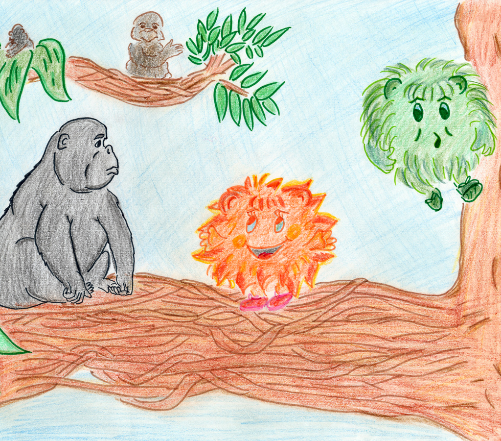 Девочки взялись за руки, и ушли за деревья, а дедушка с Пухликом сели на большой камень, и Пухлик рассказал, как он нашел Поночку. Вскоре к ним вернулись девочки. Маленькую Поночку трудно было узнать – она была ярко-оранжевого цвета, шерсть лоснилась на солнце, а на макушке был большой красный бант.