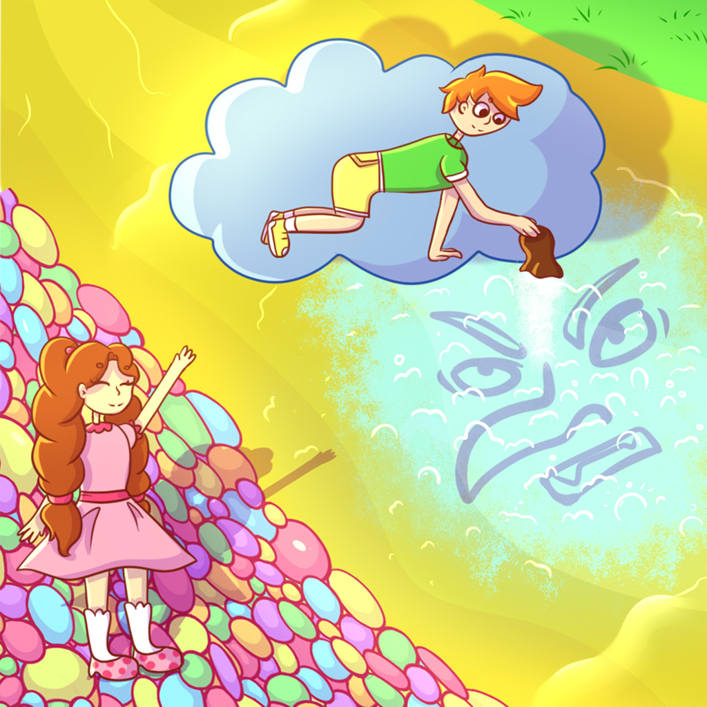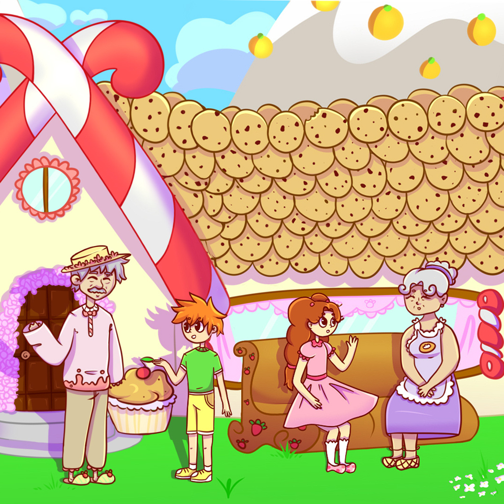 Друзья шли вдоль горы, под ногами хрустели камешки-леденцы. В воздухе приятно пахло халвой. Обойдя очередной выступ горы, они увидели красивейшую картину. Перед ними простирался луг с нежной зеленой травой и красными маками. По центру луга стоял пряничный домик, к нему вела белая тропинка из сахарной пудры. Резные ставни обрамляли маленькие оконца. Одно окно было открыто и белые ажурные занавески колыхались на ветру. За домом журчала Молочная река.