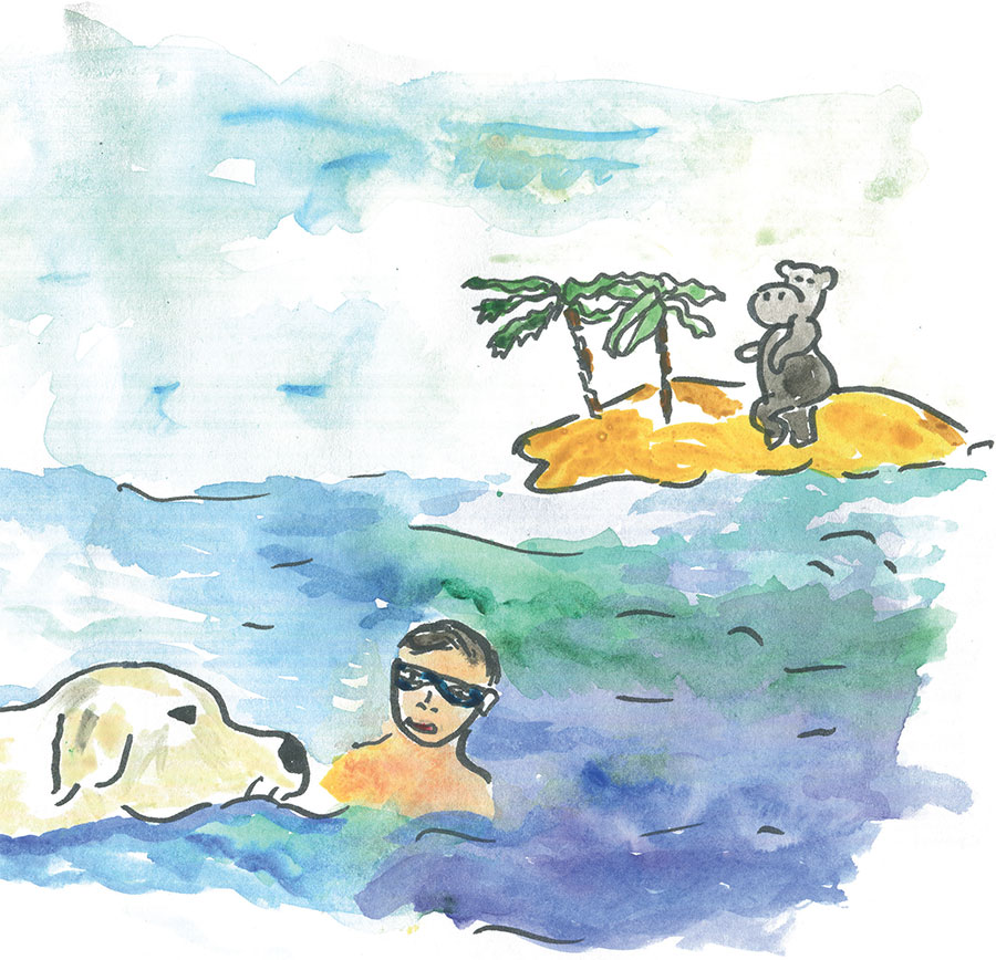 Саше шесть лет, и он мечтает поехать на море и доплыть до необитаемого острова. На острове будет много диковинных растений: пальмы, бамбук, лианы. Говорят, там живёт танцующий бегемот!