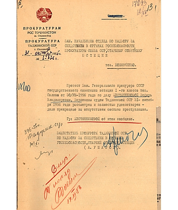 Протест заместителя Генерального прокурора был полностью удовлетворен, о чем было сообщено прокуратурой Таджикской ССР самой Жестянниковой и заместителю начальника отдела по надзору за следствием в органах госбезопасности прокуратуры союза СССР, старшему советнику юстиции тов. Холявченко. Письмо прокуратуры Таджикской ССР от 31 октября 1956 года хорошо сохранилось: