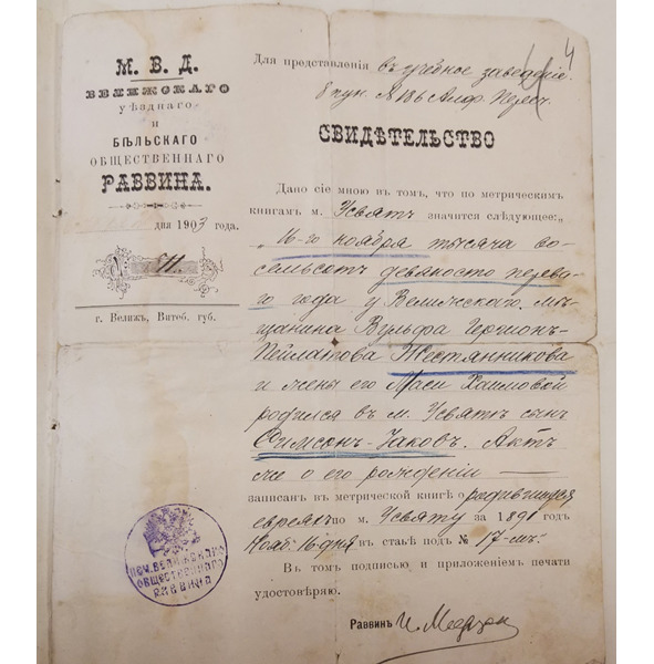 Что за город, в котором он родился, не совсем понятно, так как в метрике местом рождения числится местечко Усвяты. Возможно, рожать Масю Хаимову отвозили в райцентр? Если обратиться к истории города Велиж, то становится ясно, что в 1891 году он был уездным городом Витебской губернии. Получается, что жили они в Усвятах, там же Яков числится в метриках, а сам факт родов состоялся в уездном городке Велиж.