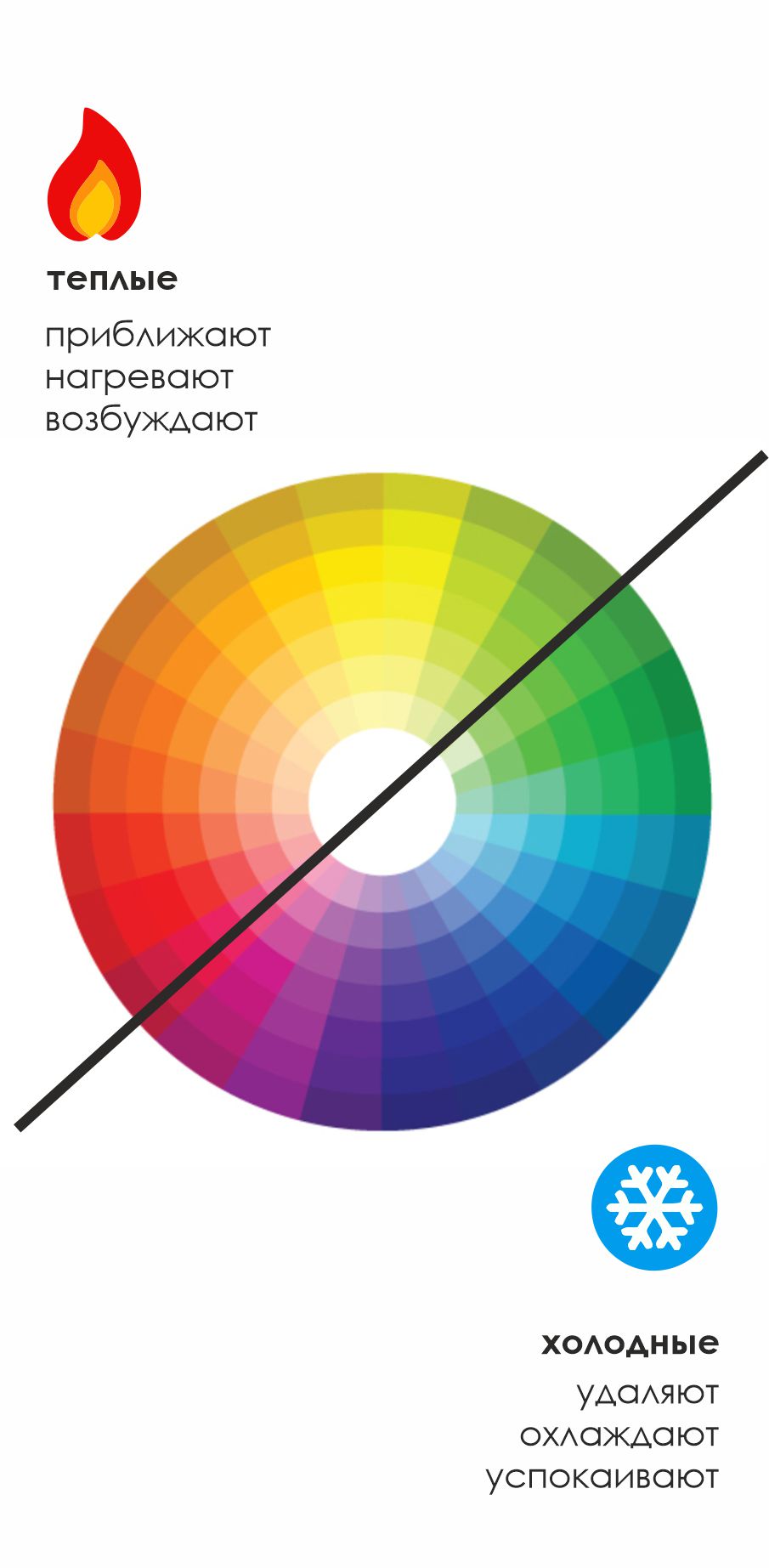 В теплые цвета попадает желтый, а в холодные – синий. Красный и зеленый называют нейтральными, они могут менять свою температуру, так как находятся на границе.