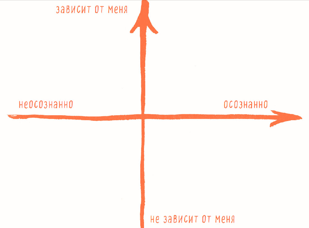 Система координат будет состоять из двух осей: ось X и ось Y. Ось X – горизонтальная ось «осознанно-неосознанно». Ось Y – вертикальная, это ось «зависит от меня – не зависит от меня». Таким образом у нас получаются четыре квадранта (да простят меня те, у кого аллергия на математику!). Увидев эти четыре квадранта, участники тренингов сразу же заполняют их своими примерами, давая им логичные названия.