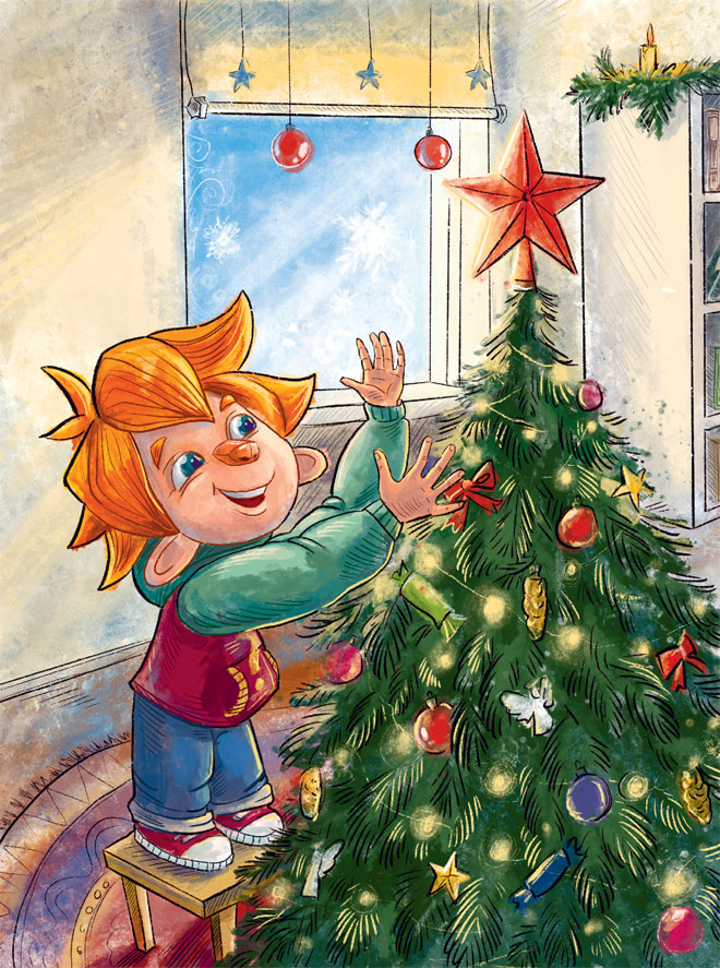 – Дядя Кузя, такая красивая ёлочка у нас получилась! Осталось только звезду на верхушку надеть.