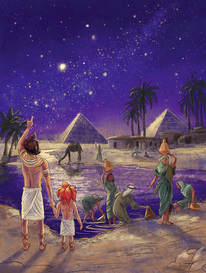 – Давай по порядку. Это Нил. Не просто большая река, а река, от которой зависели жизнь и благополучие египтян. Мы наблюдаем разлив Нила. После долгой засухи вода прибывает. Скоро Нил выйдет из берегов, напоит иссохшую землю, сделает её плодородной, люди смогут вырастить урожай. Обычно Нил разливается в конце июля, когда на небе появляется яркая звезда Сириус. Посмотри на небо. Видишь? Вон он – Сириус.