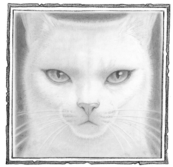В этот самый миг Тиффани посмотрела вниз и сквозь жёлто-зелёную дымку усталости увидела белоснежную кошку, величественную, как герцогиня. Это была Эй, кошка матушки Ветровоск, Тиффани узнала её с первого взгляда, ведь она сама когда-то подарила матушке котёнка. К её ужасу, одна из тётушек попыталась выгнать Эй.